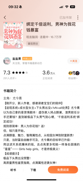 丫丫丫 https://fanqienovel.com/page/7522450583723199550 推荐理由:四颗半星,和上篇类型有点像、只是这篇的女主不需要攻略男神好感度,只要优质异性给女主花钱就可以返利、包括社团聚餐、只要是优质男性花钱女主就能得到返利、也就是友情,商务来往都OK、不需要前行恋爱。其实如果不谈恋爱、只赚钱我会更喜欢